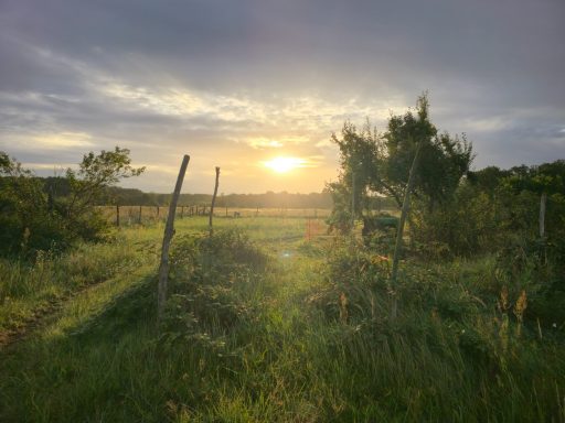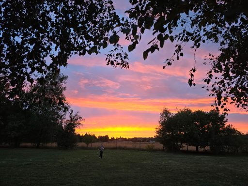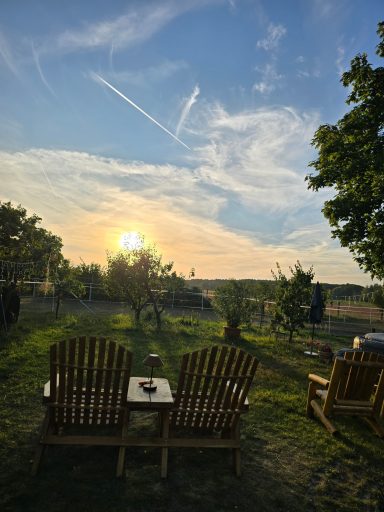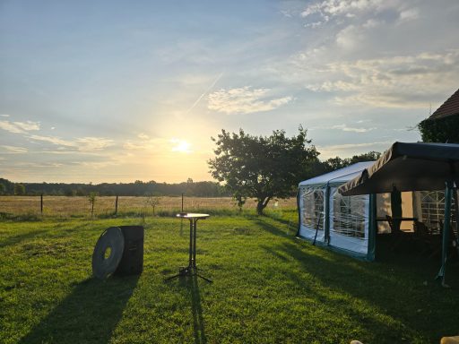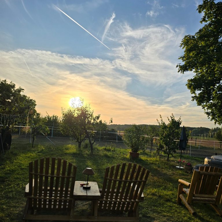 Wenn die Sonne langsam hinter den Feldern des Havellands versinkt, zeigt unser Hof seine romantischste Seite. Der Himmel färbt sich in warmen Tönen von Gold, Orange und Rosa – ein Schauspiel, das man einfach nicht vergisst.