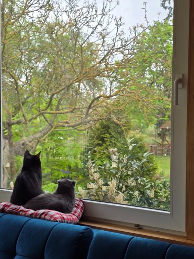 Unsere Katzen dagegen lieben die Ruhe im Haus. Sie genießen es, das Hofleben aus sicherer Entfernung zu beobachten – elegant und unabhängig, wie es Katzen eben sind.