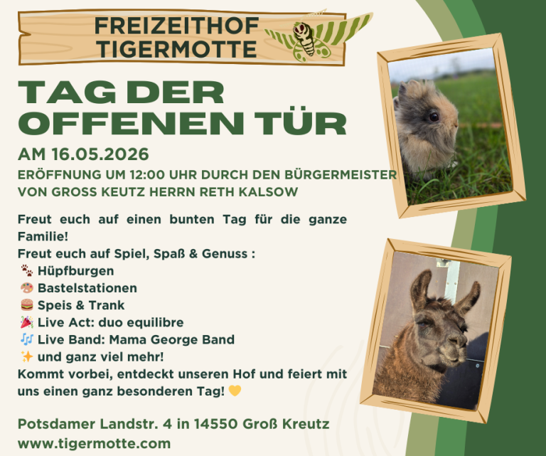 Am 16. Mai 2026 laden wir euch herzlich zu unserem Tag der offenen Tür auf dem Freizeithof Tigermotte ein. An diesem Tag öffnen wir unsere Tore und möchten euch unseren Hof, unsere Tiere und unsere Ideen ganz persönlich vorstellen.